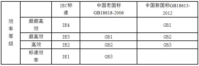 GB18613中的能效等級分為1級、2級和3級,其中1級效率為高。國際標準中能效等級分為IE4、IE3、IE2、IE1四個等級。