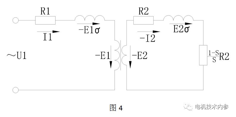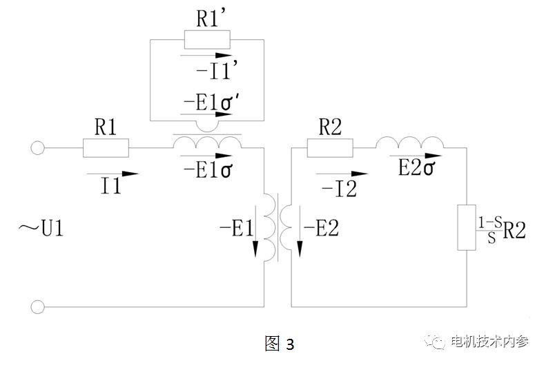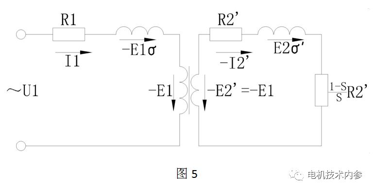 圖4是正相繞組的等效電路,圖5是基于圖4將轉(zhuǎn)子參數(shù)轉(zhuǎn)換到定子側(cè)的情況,圖6完全等效于圖5,已經(jīng)演變成異步電機(jī)的精確等效電路。